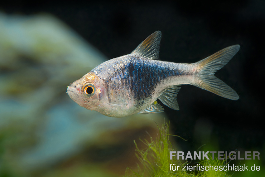 Hierbei handelt es sich um die blaue Zuchtform der Keilfleckbarbe. Trigonostigma heteromorpha 'Blau' wird bis zu 5 cm groß und benötigt ein kleines Aquarium (ab 54 l), das mit Sand als Bodengrund und Wurzeln versehen ist. Aquarienpflanzen sollten zur Strukturieung und Ablaichmöglichkeit vorhanden sein. Bei einem PH Wert von 5 - 7 und einem GH Wert von 5 - 15 °dGH fühlen sich die Tiere, die im Schwarm gehalten werden sollten, schnell wohl. Im Aquarium bevorzugt Trigonostigma heteromorpha 'schwarz' den mittleren Bereich.